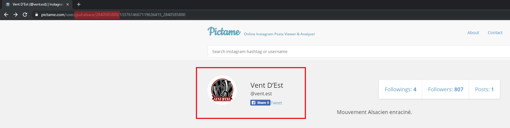 On apprend ici que le compte associé au nom d’utilisateur “@bastion_social_strasbourg” a auparavant été associé à celui “@gud.alsace”. Mais surtout, en cliquant sur ce lien, on arrive sur la page de Vent d’Est. Dans l’URL, on retrouve le User ID du compte “@vent.est” ainsi que le nom d’utilisateur “gud.alsace”.