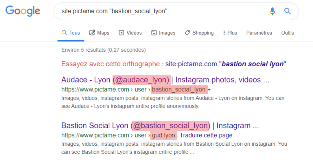 On réitère la recherche Google, cette fois-ci avec le nom d’utilisateur “bastion_social_lyon” en filtrant pour obtenir uniquement les résultats sur le site pictame.com.