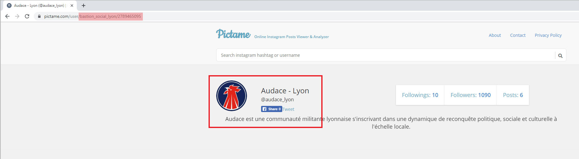 Dès le premier résultat, la réponse est claire: il s’agit bel et bien du même compte Instagram. En cliquant sur le lien, on tombe sur la page d’Audace et on retrouve encore une fois dans l’URL le User ID. Celui-ci a donc été associé successivement à “@gud.lyon”, “@bastion_social_lyon” et “@audace_lyon”.